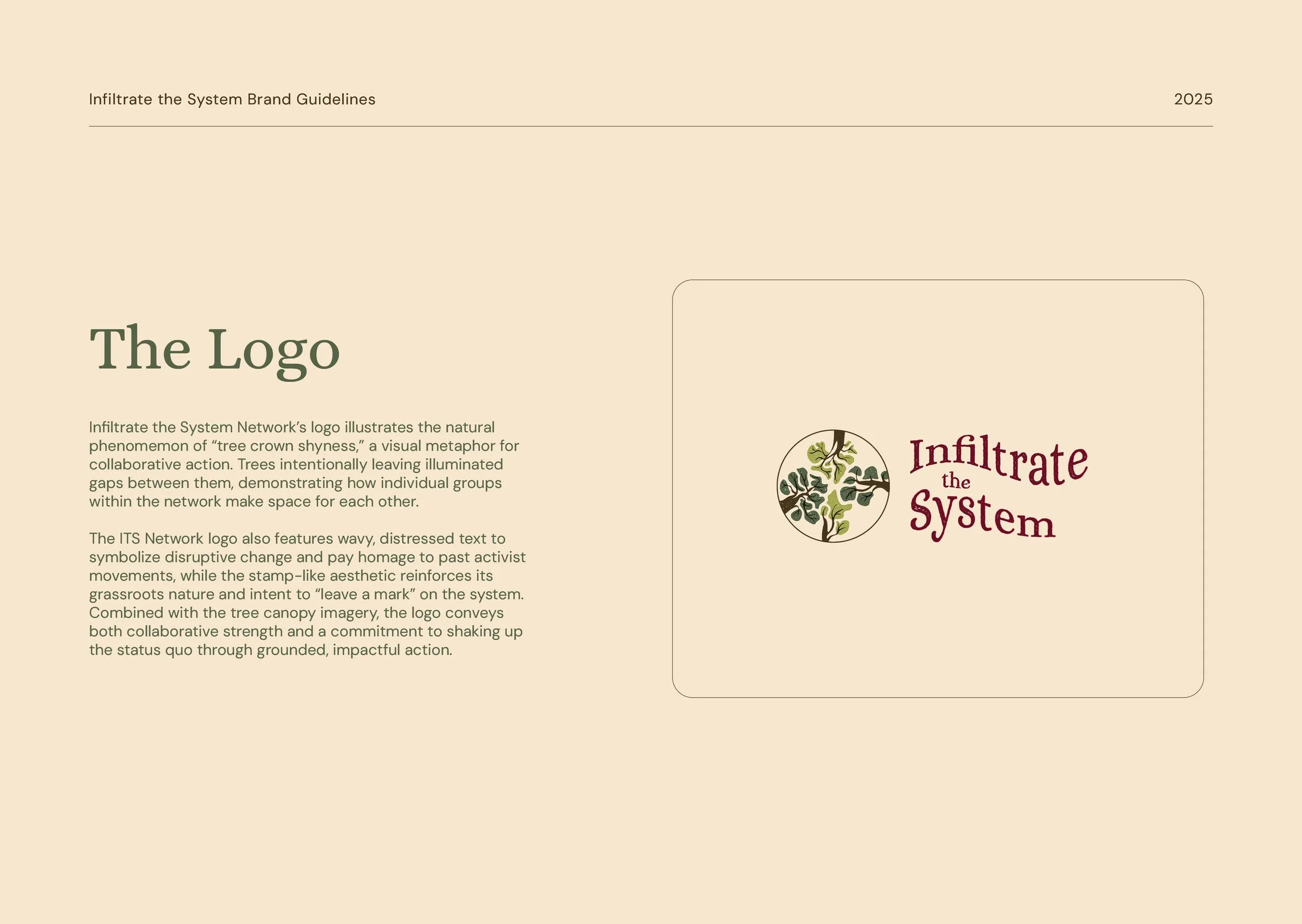 The Infiltrate the System (ITS) Network's brand identity is built upon a foundation of collaborative action and disruptive change, visually represented by a logo that embodies "tree crown shyness"—the natural phenomenon of trees creating space for each other. This concept is further reinforced by wavy, distressed text and a stamp-like aesthetic, paying homage to past activist movements and highlighting the network's grassroots origins. A vintage-inspired color palette, drawing from natural tones and reminiscent of the 60s civil rights movement, connects the brand to themes of nature and youth activism. To maintain authenticity, imagery focuses on interconnected natural ecosystems, enhanced with a subtle grain effect. Custom-developed illustrations, employing bright, bold colors with a worn effect, introduce a playful yet genuine visual language, evoking a vintage-inspired aesthetic. Importantly, accessible color pairings, meticulously chosen for WCAG compliance, ensure inclusivity and broad usability across diverse platforms, making the brand's message accessible to all.